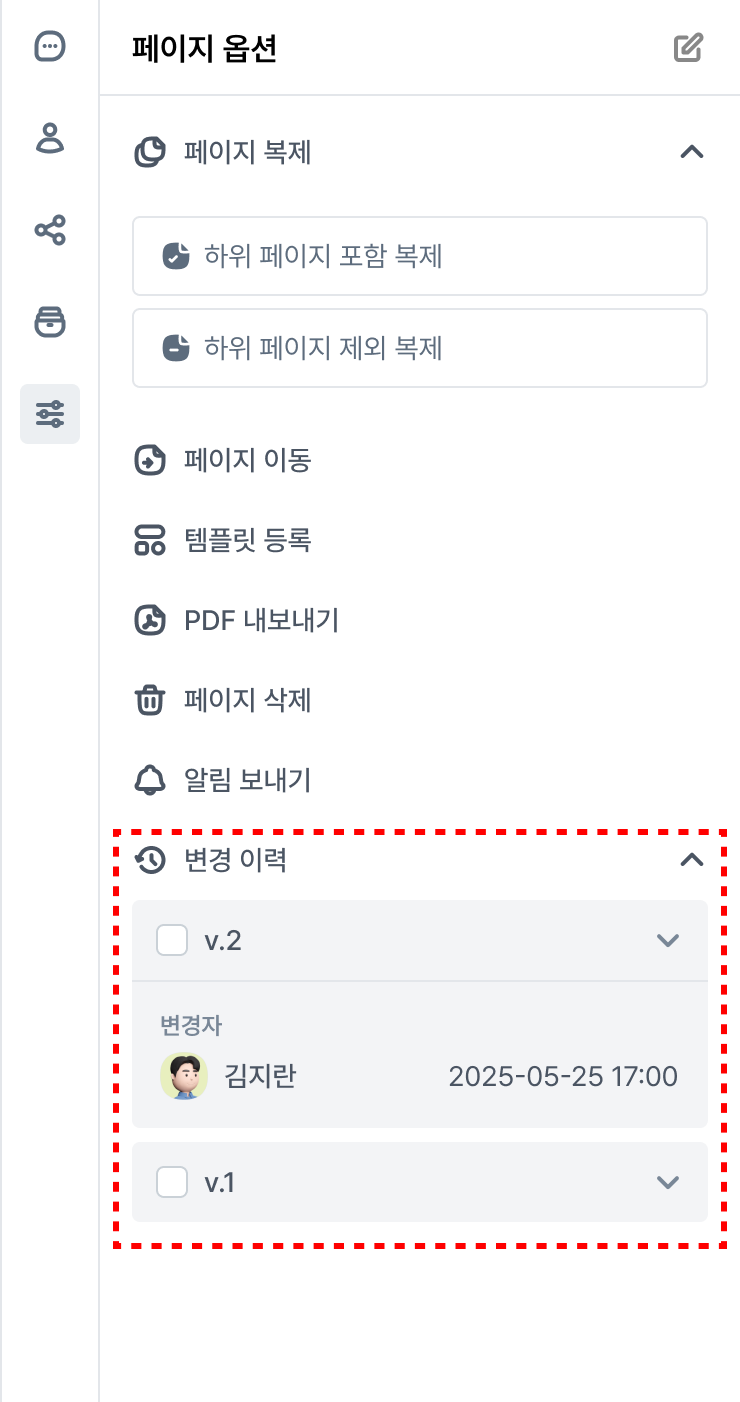 페이지 옵션에서 해당 페이지의 변경 이력을 확인할 수 있어요. 누가, 언제, 어떤 내용을 수정했는지 확인할 수 있어 문서 내용의 투명성을 확보할 수 있겠죠? 다만, 접근 권한에 따라 수행 가능한 작업이 다르다는 점을 참고해 주세요!