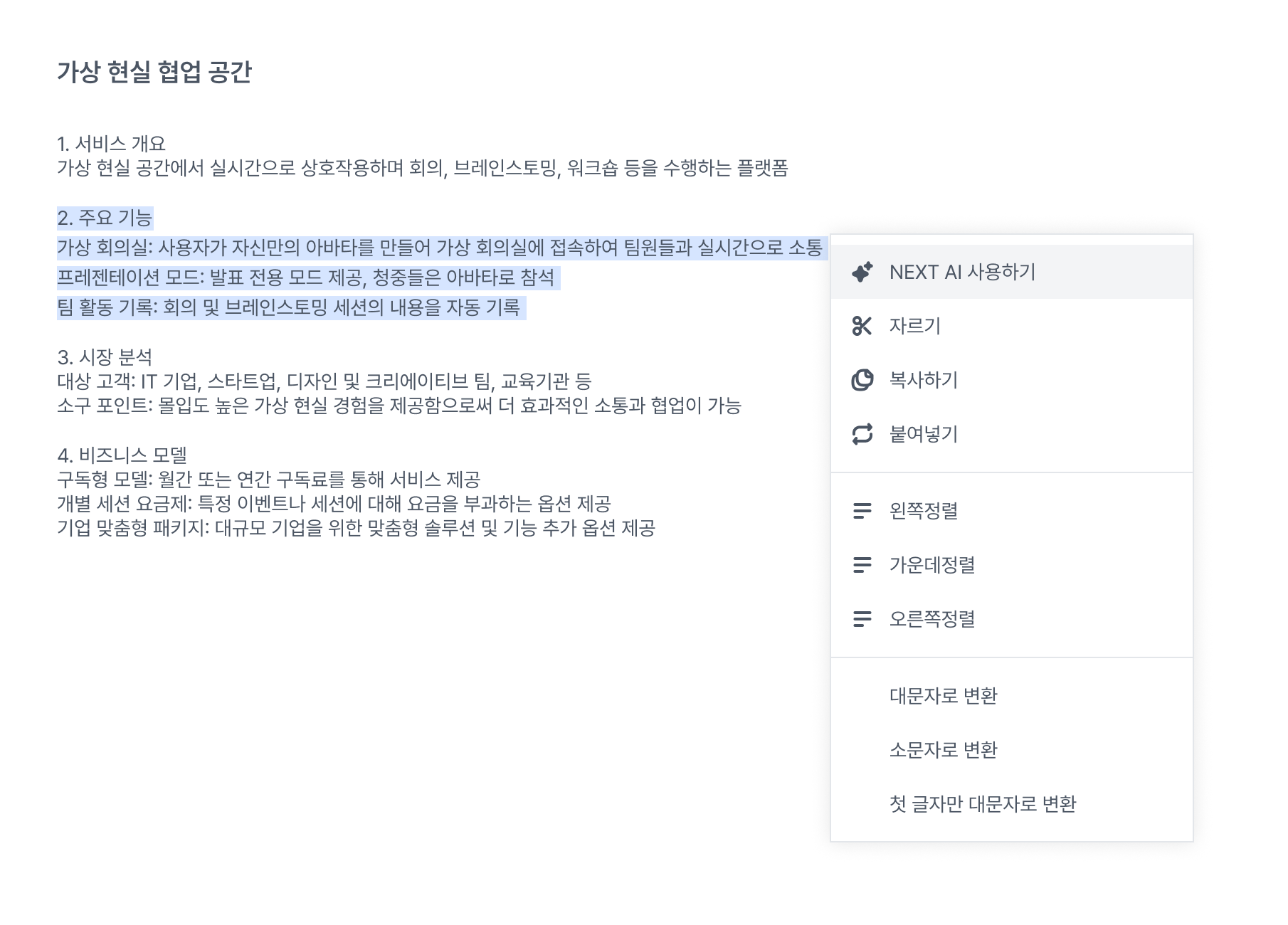 그럼 이제 NEXT AI가 어떤 기능들을 제공하고 있는지 살펴볼까요?