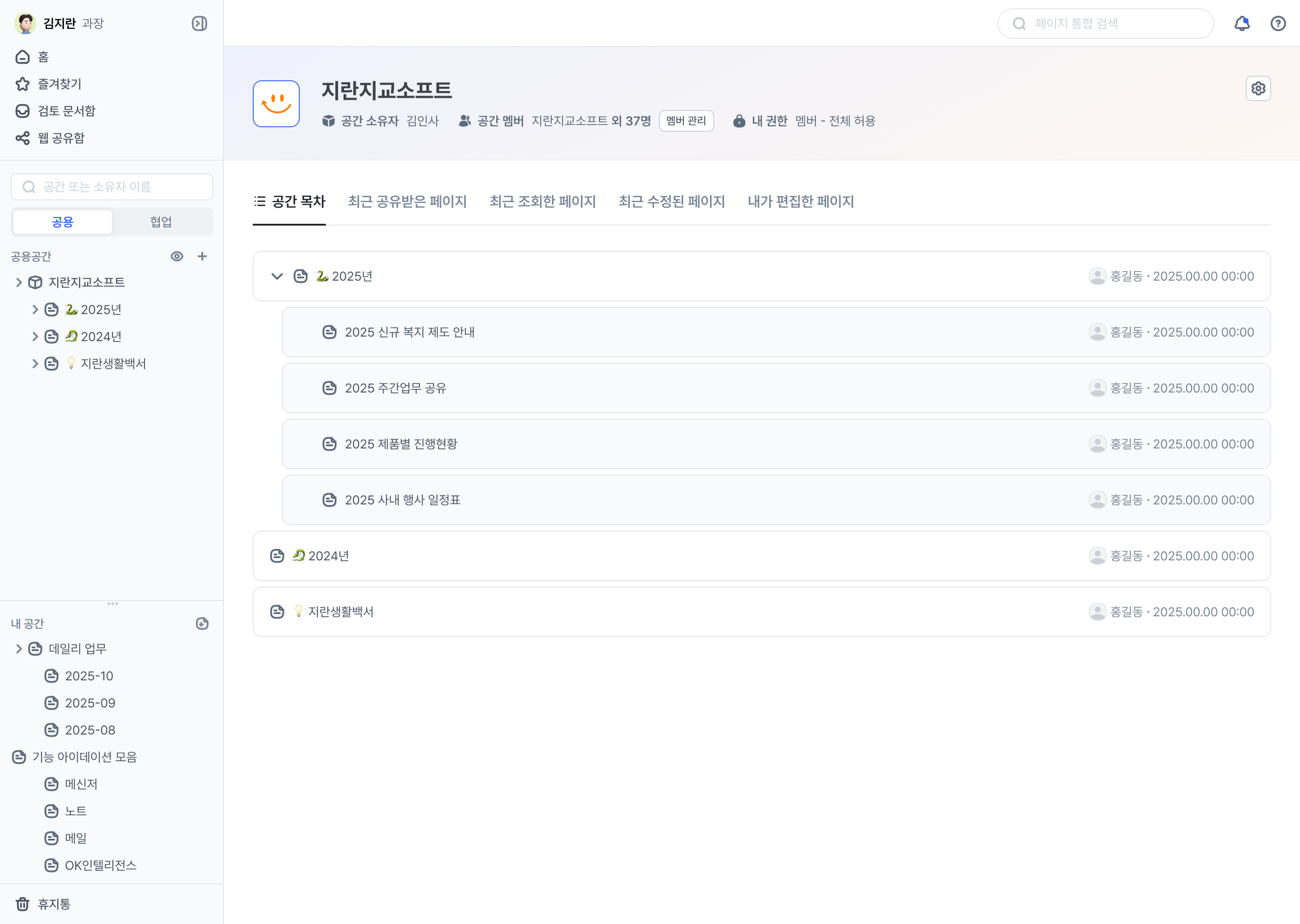 - 공용 공간 > 지란지교소프트(공간) > 🐍 2025년(상위 페이지) > 2025 신규 복지 제도 안내(하위 페이지)