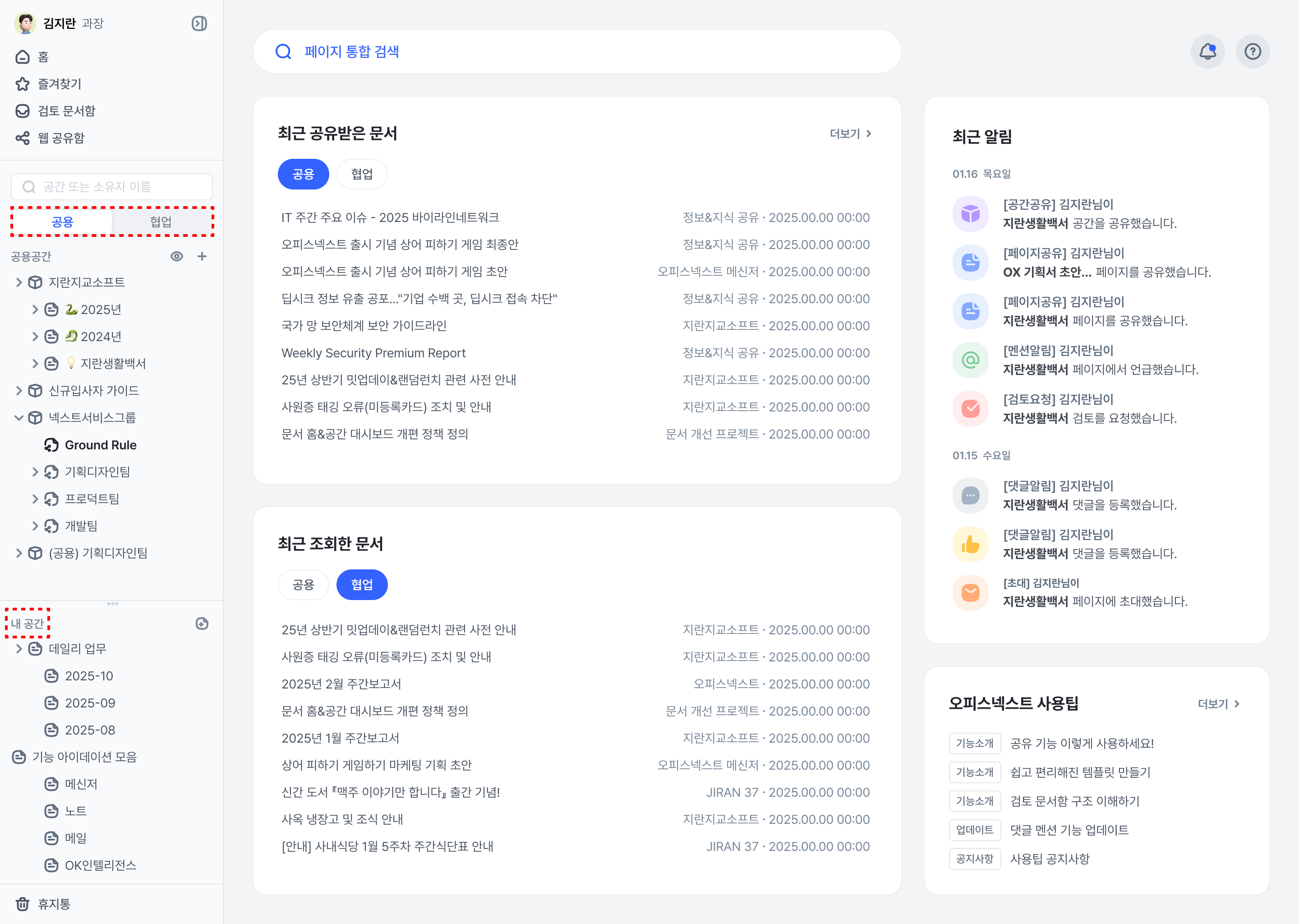 최근 공유받은 문서, 최근 조회한 문서, 최근 알림 등을 한눈에 확인할 수 있어요.