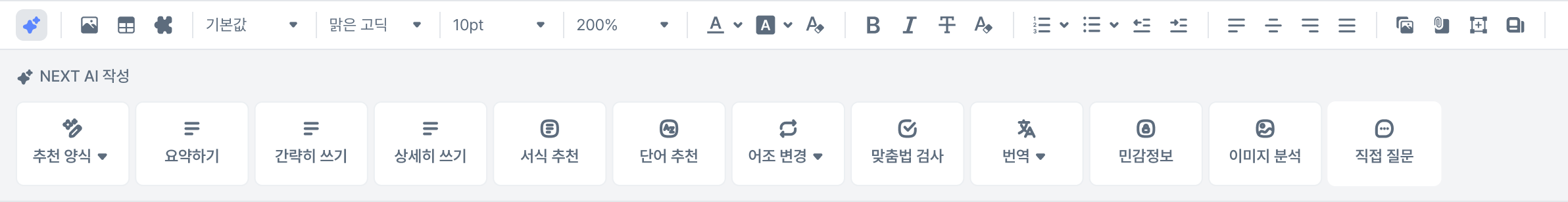 새 페이지/툴바/퀵메뉴/마우스 우클릭을 통해 언제든지 필요할 때마다 NEXT AI를 사용할 수 있습니다.