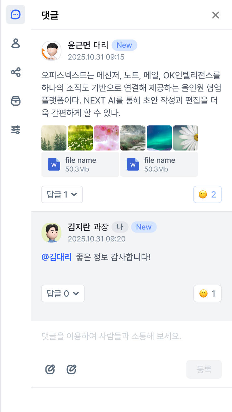 댓글에서는 멘션, 파일 첨부, 이모지 리액션 기능이 지원됩니다.
