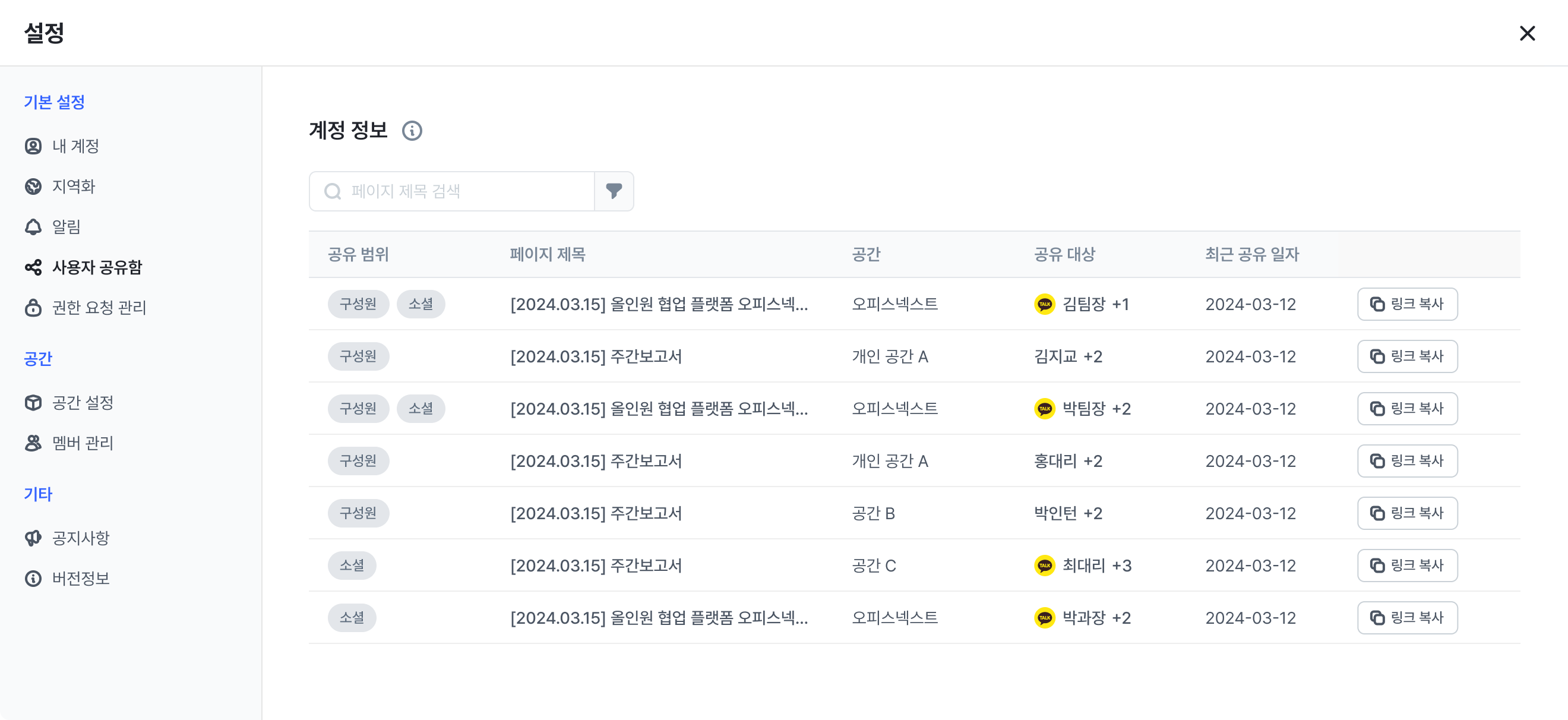 사용자 공유함은 내가 사내 구성원 또는 소셜 사용자에게 공유한 페이지를 모아볼 수 있는 기능이에요.
