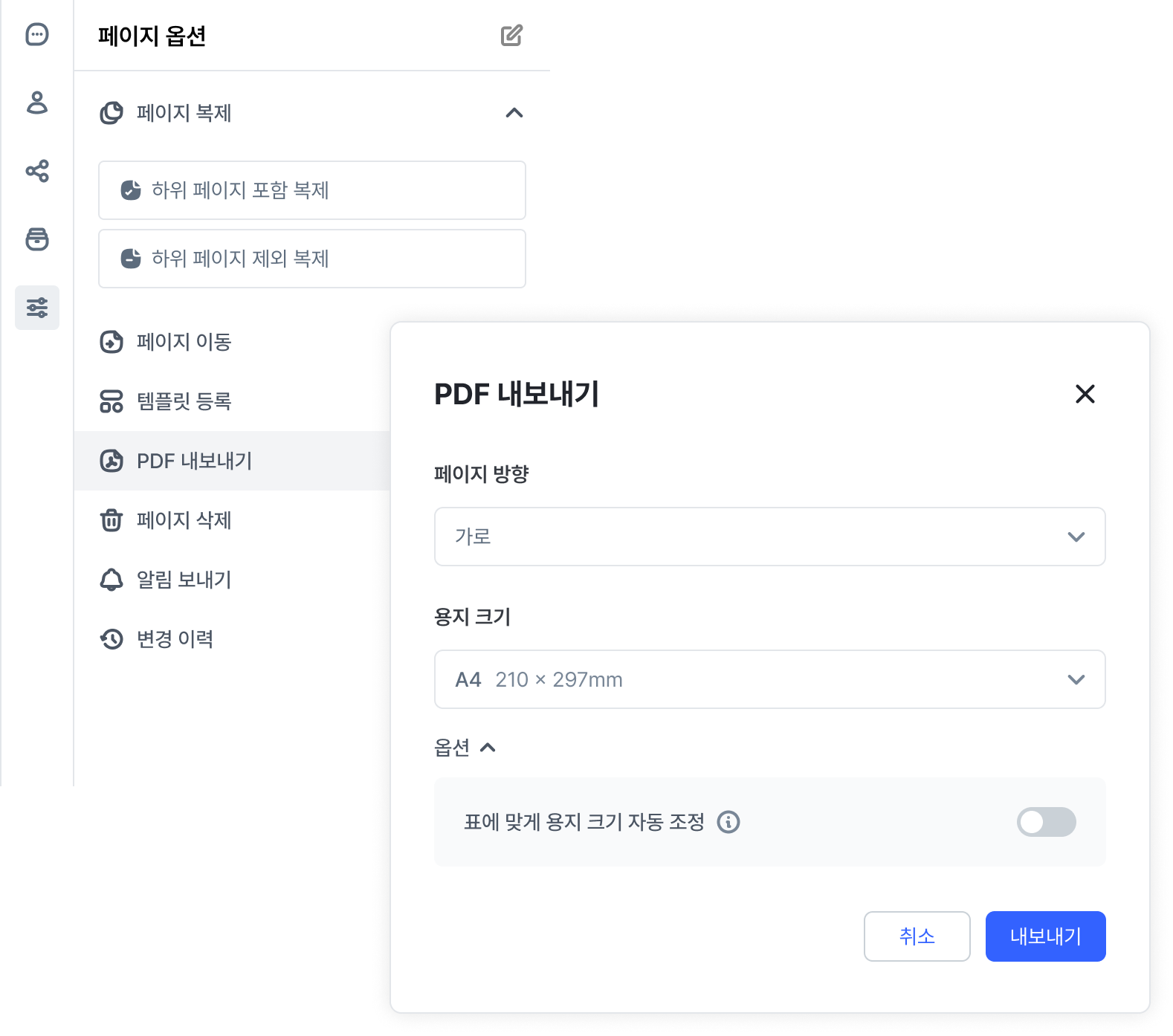 페이지 옵션에서 PDF 내보내기를 클릭하고 방향과 크기 등을 설정하면 PDF 형식의 로컬 파일로 내보낼 수 있습니다.