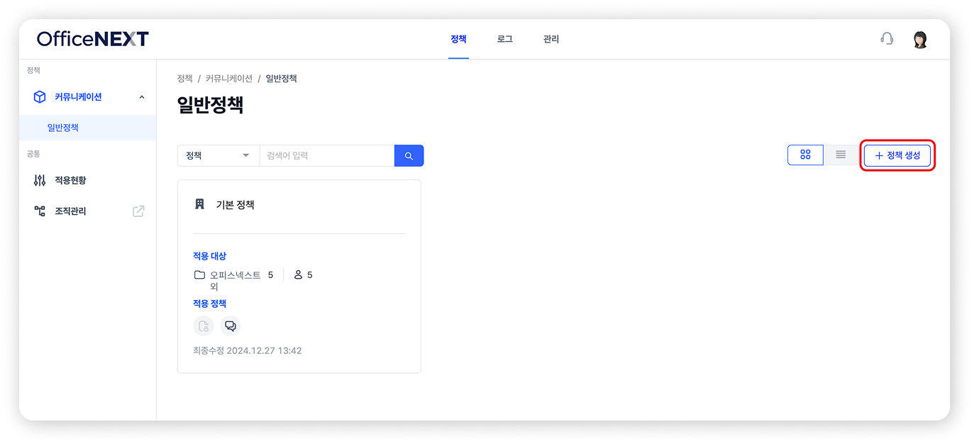 오피스넥스트 메신저 관리자 페이지에 접속하면 제일 먼저 [정책] 페이지가 보일 거예요.