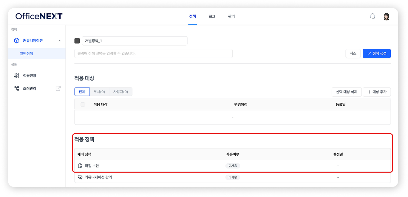 하단 [적용 정책] 세션의 [파일 보안] 란이 보이시나요? 해당 버튼을 클릭해 주세요.