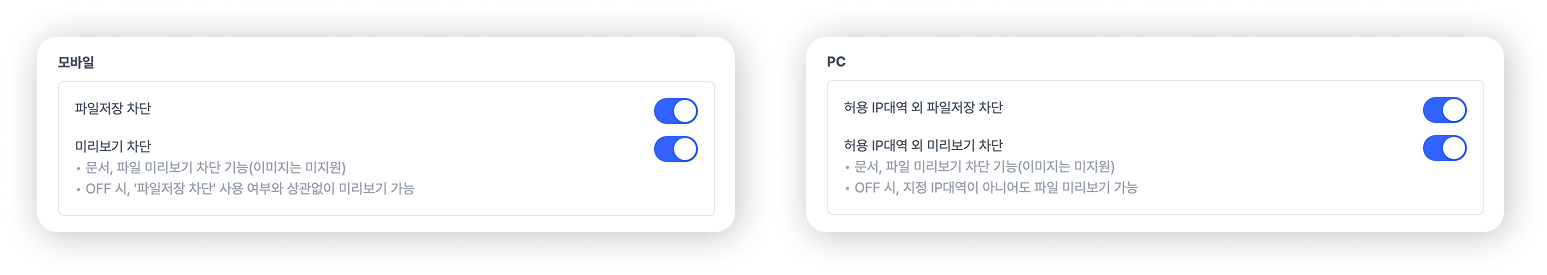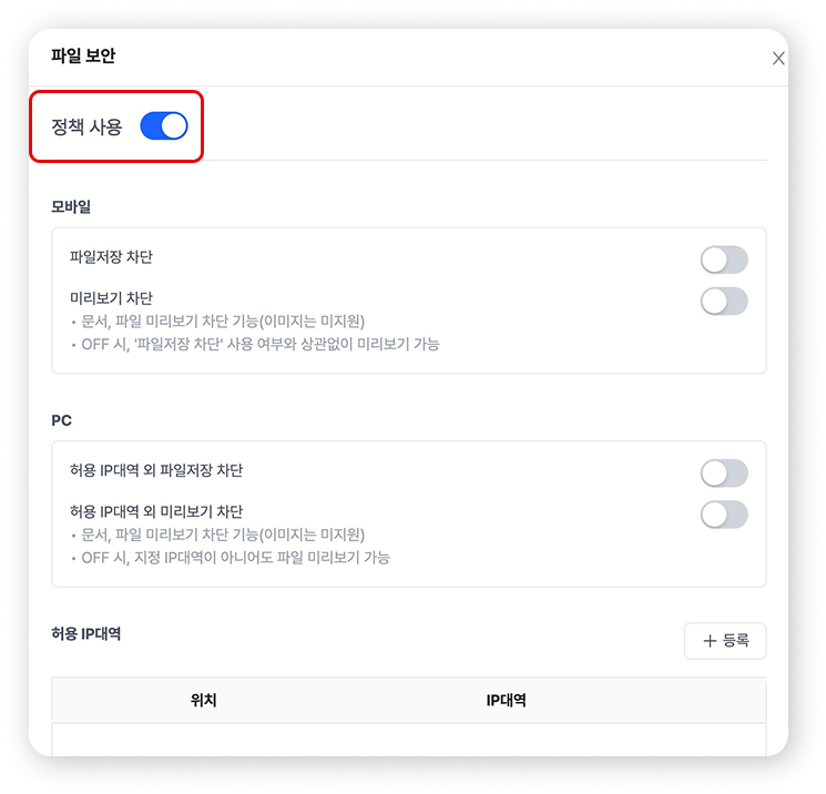 💻 허용된 IP가 아닌 곳에서의 파일 저장과 미리보기를 허용/차단할 수 있습니다.