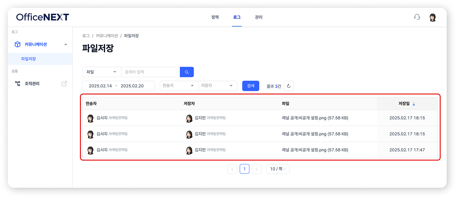 메신저 관리자 페이지 '로그' 탭에서는 파일 전송 및 저장 이력을 확인할 수 있습니다.