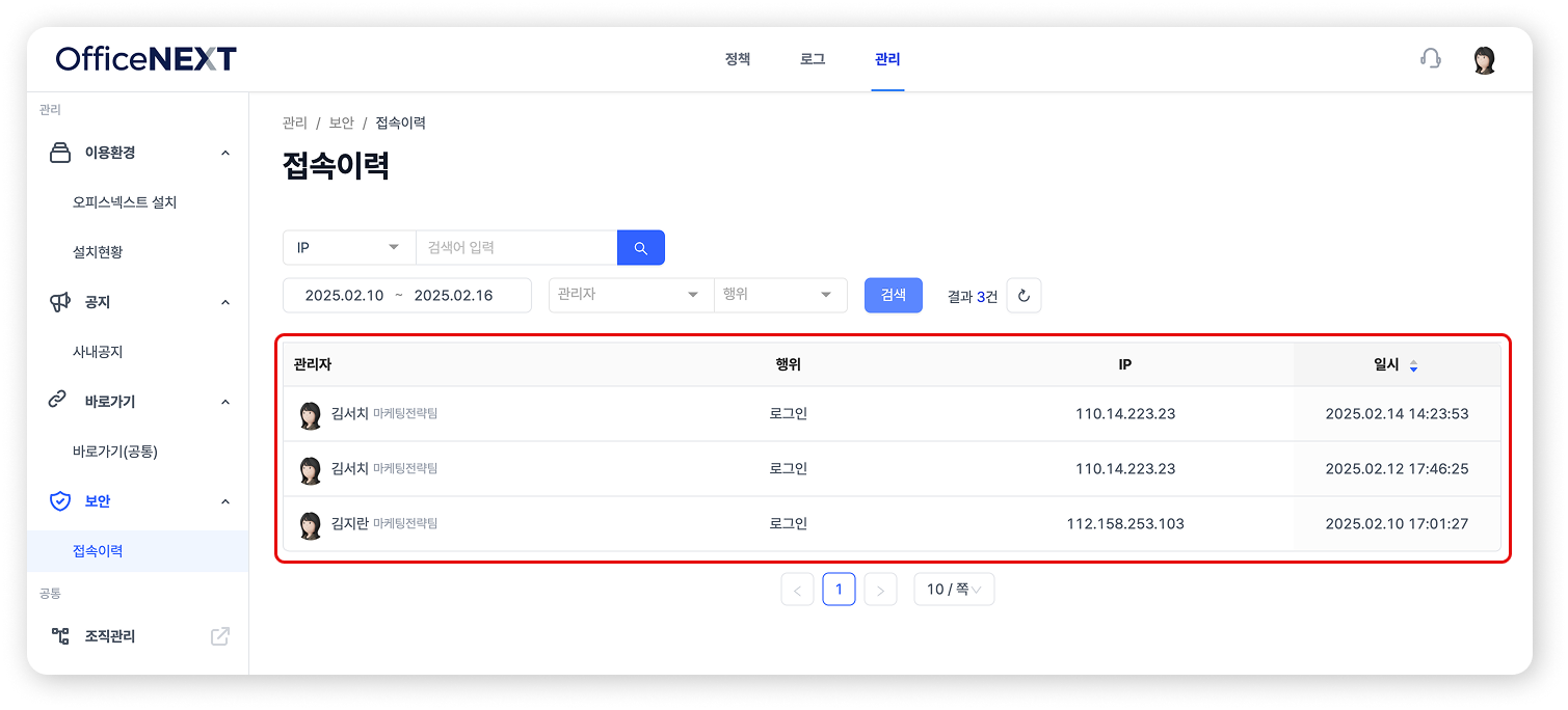 [관리] 탭 > [보안] 메뉴를 클릭하면 메신저 접속 이력을 확인할 수 있어요.